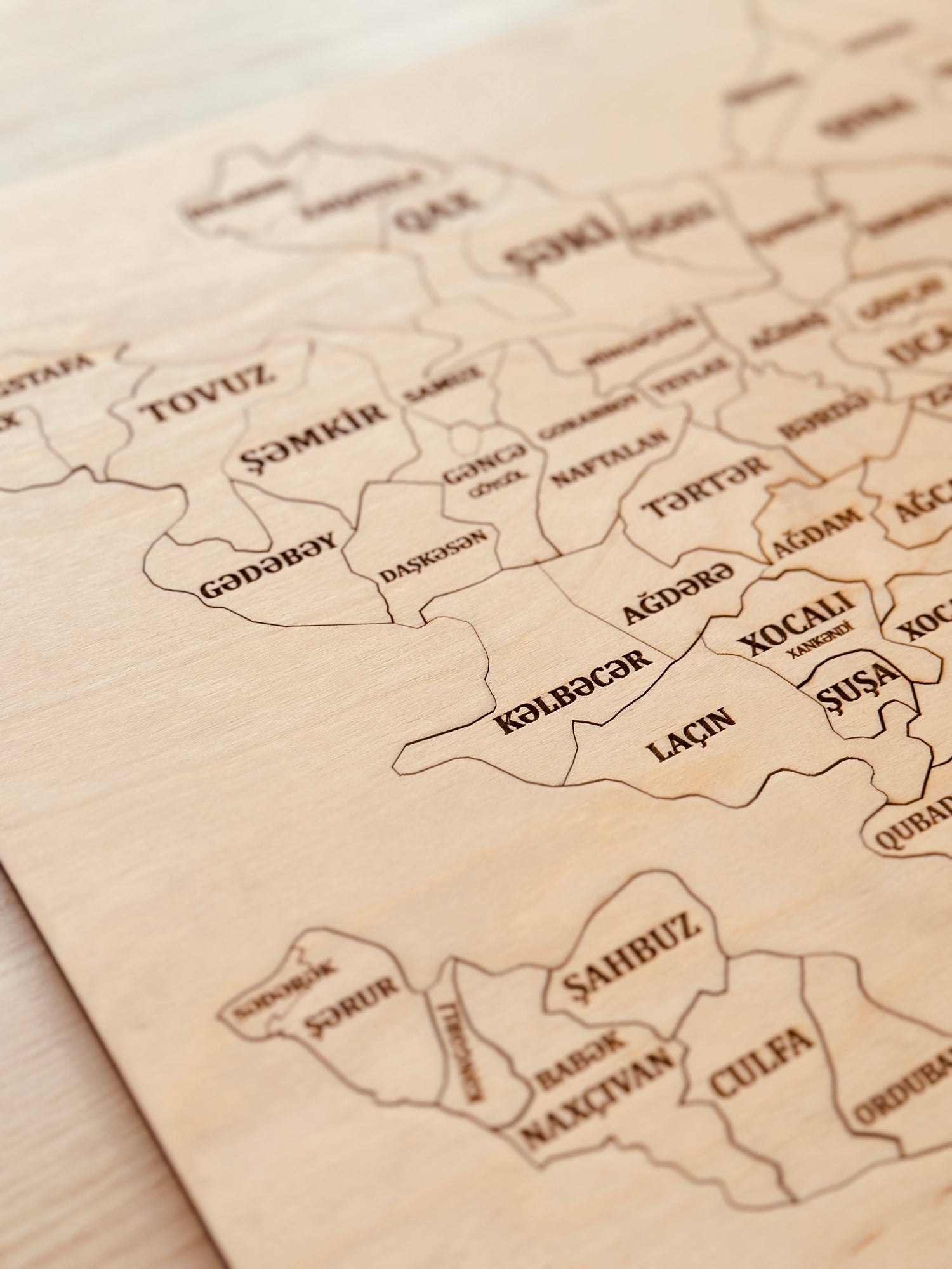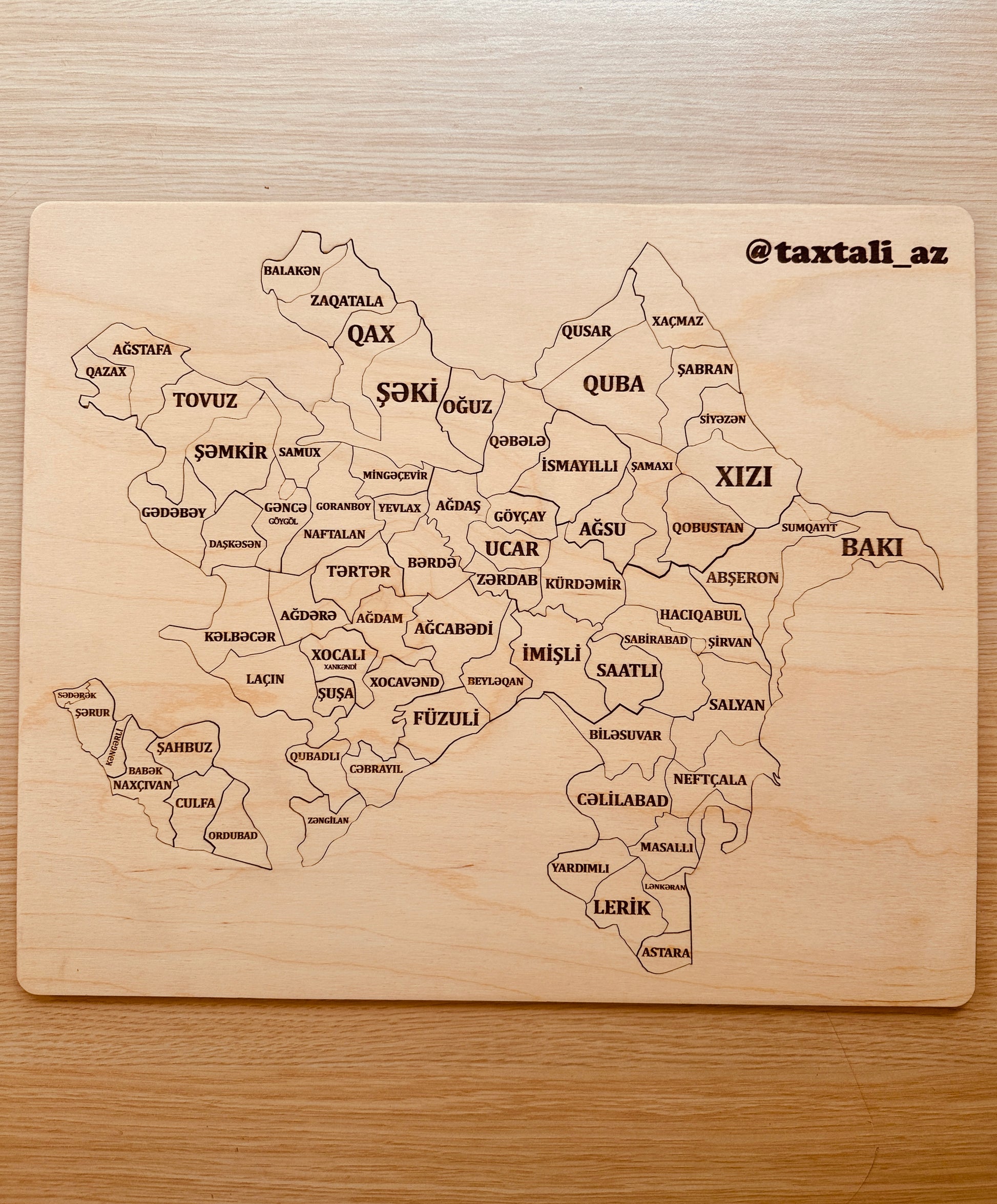 Azərbaycanın hər bölgəsini özündə əks etdirən bu taxta puzzle xəritə, həm dekorativ, həm də maarifləndirici bir əsərdir. Hissə-hissə birləşdirildikcə ölkəmizin gözəl rayonları bir tablo kimi qarşınıza çıxır.